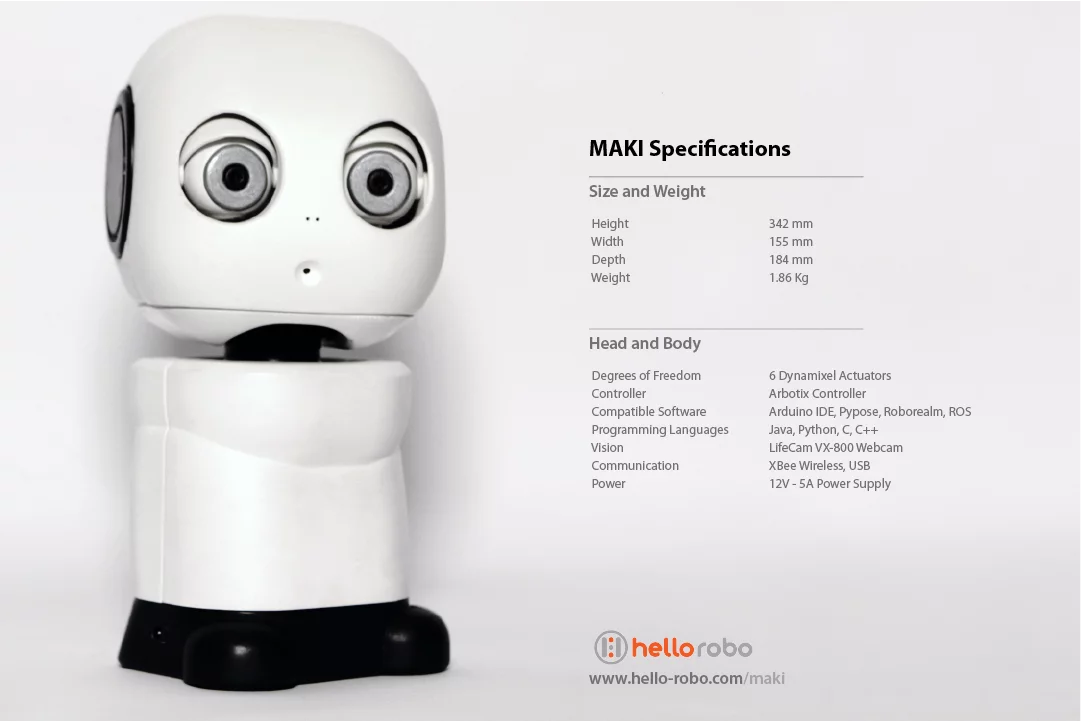 MAKI's head, eyes, and eyelids move independently using six servo motors sold by Robotis, controlled by an Arbotix Robocontroller or Arduino. By connecting it to a PC and open-source software, its webcam could be used to perform face recognition, object tracking, speech recognition, and text-to-speech – all essential for basic human-robot interaction (HRI) studies. University labs interested in this area of research could save loads of time by adopting MAKI as their platform rather than designing and engineering one from scratch.