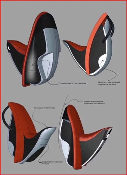 The wheels are designed for rider safety and performance as well as looking sensational. The single spoke, large hub and streamlined top guards protect the rider from injury - the wheel itself is the only exposed rotating part. The axis of the wheels is shifted on acceleration and steering pistons attached between arm joint and rim also form part of the CPU controlled movement. Round torsional springs in the front wheels provide suspension to enhance the smooth ride with the overall aim being to achieve exhilaration within the speed limits.