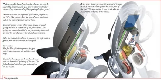 Hermes' is totally driven by a hydrogen fuel cell located underneath the rider in the cetral part of the structure. The unit draws hyrdogen from on-board tank and air from intake on the frame. The tank is positioned in the safest possible place and is secured by framework the under rider. It's also easy to reach for straightforward re-feulling.