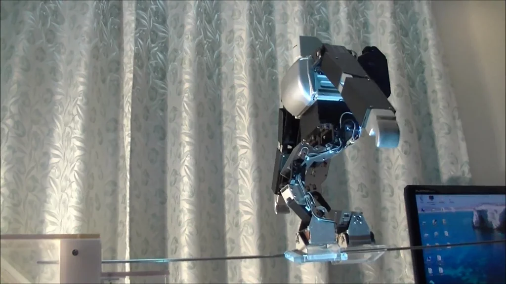 A Japanese roboticist that goes by the handle Dr. Guero, famous for programming his hobby robot to ride a miniature bicycle and walk on stilts, has managed to get his robot to balance on a tightrope. His Primer-V4 robot is based on the Kondo KHR-3HV hobby kit (which can be purchased for around US$1,800), but features a few modifications that give it the ability to inch its way along a steel wire just over an eighth of an inch (4 mm) thick.