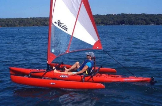 The newest edition to the Hobie line-up has a mast height of 15'2" (4.62m), weighs 115lbs (52.16kg) when fully rigged and can carry 350lbs (159kg). With the amas extended the craft is 112" (2.84m) wide, reducing to 42" when folded.