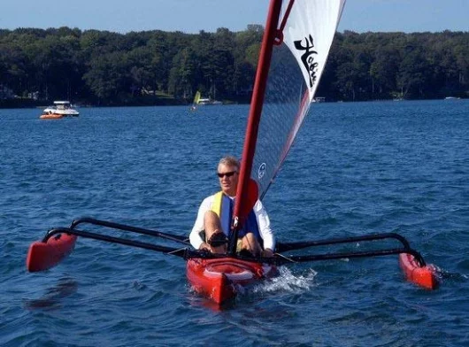 July 9, 2007 Hobie is a name that's been associated with innovation in aquatic sports since Hobie Alter started creating boards for the fledgling sport of surfing in his father's garage more than half a century ago - and this latest creation is no exception. A true "best of both worlds" invention, this unique cross between a pedal powered kayak and a trimaran adds an entirely new dimension to sailing. The Hobie Mirage Adventure Island is a 16-foot, single-person "Sail/yak" that combines the Hobie MirageDrive pedal-propulsion system with a 5.38 square meter sail and two amas (outriggers) that provide stability on the water and fold back into the hull for docking and beaching.