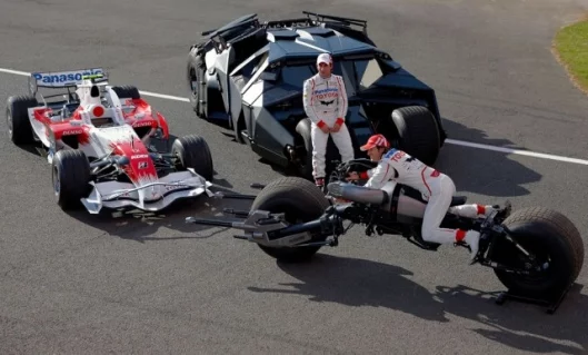 The actual Batmobile and Bat-Pod are also on show for the Silverstone event and on Thursday evening the Batmobile actually took to the track alongside the TF108. The pictures show Toyota drivers Jarno Trulli and Timo Glock with the beasties.