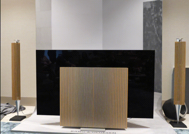 At the same store launch event, we were also able to catch our first look in person at the Beovision Harmony transforming TV – a 77-inch, 8-mm-thin LG C9 OLED panel paired with a stunning set of B&O speakers. The razor-thin screen hides behind the speakers when it's off, and when you switch it on, it rises up from behind them as the speakers gently and precisely rotate from vertical to horizontal.