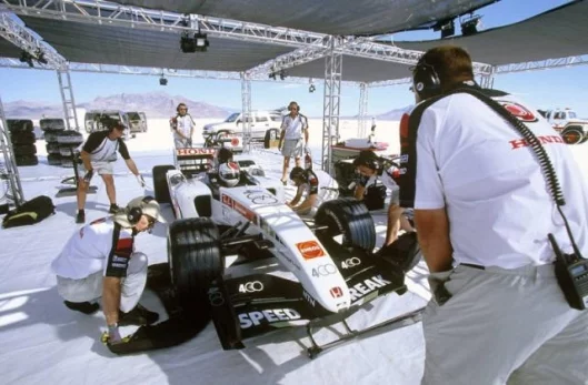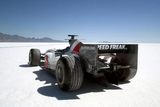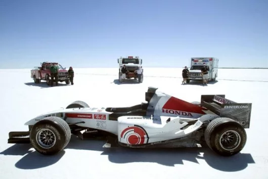July 19, 2006 Just how fast is a Formula One car? That question was answered, at least partially, on Monday morning at around 8am local time at the Bonneville Salt Flats, when Alan van der Merwe piloted a race legal Honda 007 along a seven mile-long salt straight, achieving a speed of 220.571mph (354.975 km/h) for the flying mile and 220.897 mph (355.499 km/h) for the flying kilometre. To be frank, we were a bit disappointed too, but one of the problems of Bonneville and lots of horsepower is that of traction. Driver Alan van der Merwe put it in perspective when he said, “We haven’t done 400kph yet though, which is our ultimate target. In a way it’s quite nice we didn’t, because it shows that this is a genuine challenge and not just a case of us turning up, nailing it and going home. You have to work for every extra mile an hour here and we may not break the 400 mark, but that’s still our goal.”