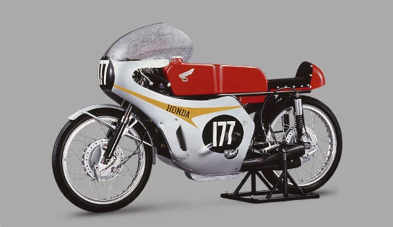 Within a few years the Honda name was gracing world championship winners in all categories, but it was the 125 class in which Honda first distinguished itself, and the exotic engines it created are still legendary today - the Honda works machine of 1966 comprised five (33 x 29 mm) cylinders, and produced 38 bhp at 20,500 which isn't all that bad considering that the current KTM and Aprilia machines, produce not much more than 50 bhp, and they're two strokes with a half century of knowledge extra in their design.
