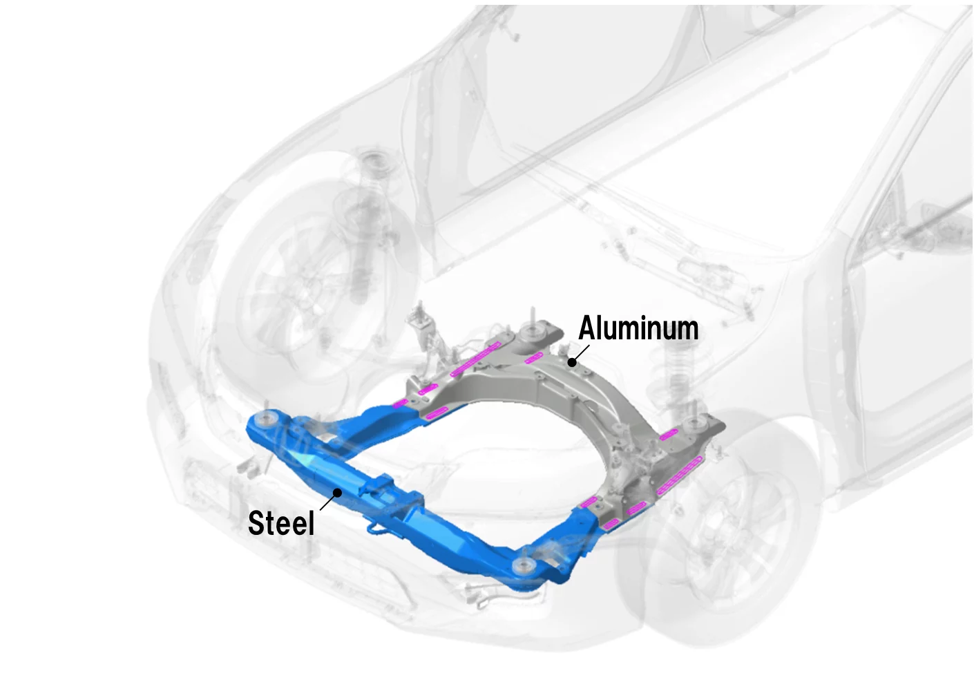 Steel/aluminum subframes built with the new technique are said to be 25 percent lighter than those made entirely out of steel, which should translate into improved fuel economy. The process also made it possible to alter the structure of the subframe, so that the mounting point for the suspension could be relocated – this change has reportedly increased the rigidity of the mounting point by 20 percent, and thereby improved the car’s dynamic performance.