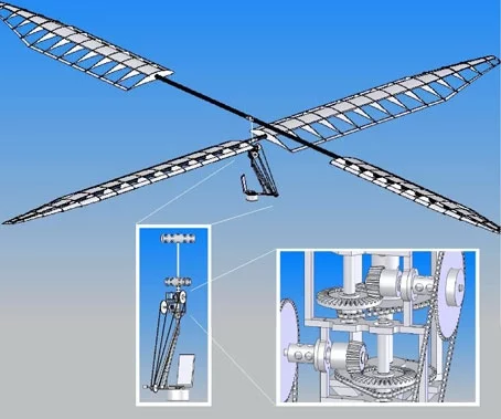 The University of British Columbia "Thunderbird" is based around two rotors rotating in opposite directions. The upper rotor is actually longer than the wing span on a 737 and plans called for the upper rotor to rotate at 3.5 rpm and the lower rotor at 6 rpm, giving a lift of 137 kilos.