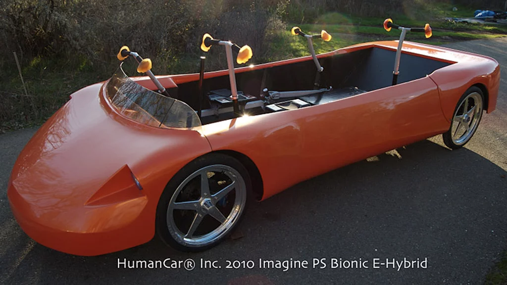 The HumanCar is the brainchild of Chief Scientist/Engineer Charles Samuel Greenwood P.E., who first hit upon the idea for a human powered car some 40 years ago. Sitting in a traffic jam in Silicon Valley in 1968 Greenwood noticed the many overweight commuters sitting in their cars breathing in noxious exhaust fumes. He was inspired to create a modest modification to vehicles that would reduce the need for conventional fuel, while at the same time providing exercise. Searching for a full-body workout Greenwood eschewed a bicycle-type mechanism in favor of the rowing-like mechanism and developed the forerunner to the Impulse PS, the FM-4 (Fully Manual – 4 people). This was a research “skeleton” car that was built to test the concept of a human powered vehicle and the lessons it provided eventually led to the development of the Impulse PS (Power Station).