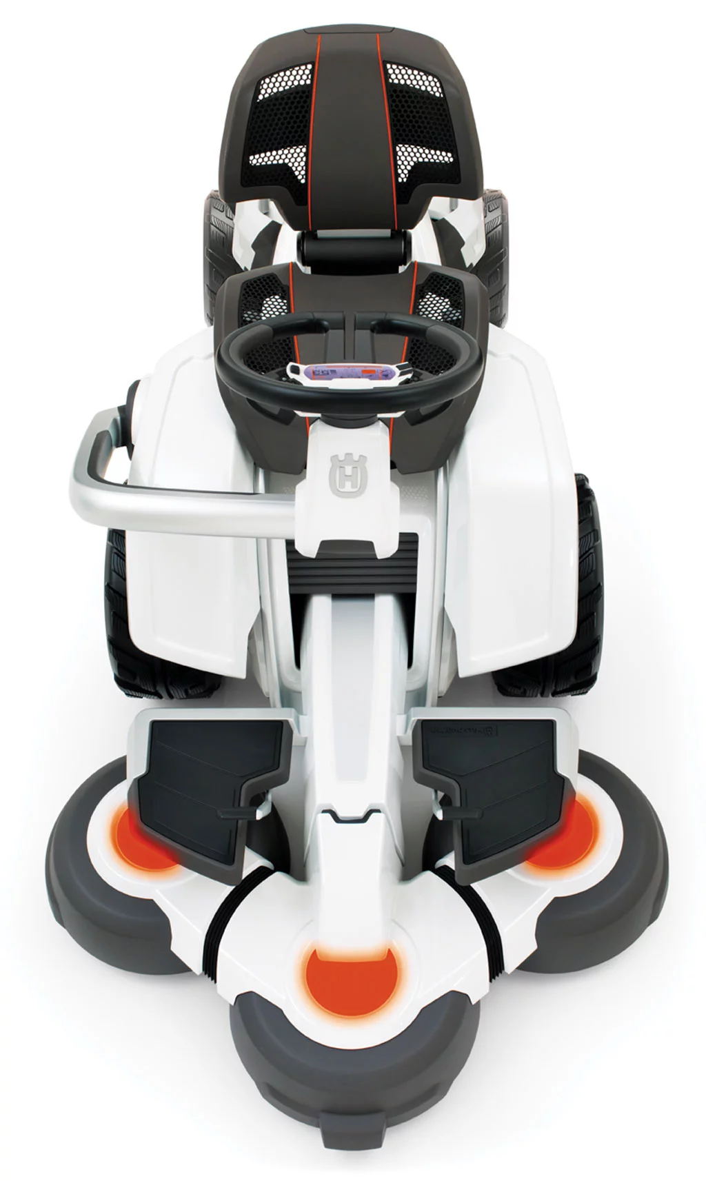 Looking down at the dash, you'll see a speedo readout, plus the height and separation of your cutter blades, remaining battery time and service needs. Sensors can also check out what's going on with your grass and give you recommendations on speed and cutter height for the perfect lawn.