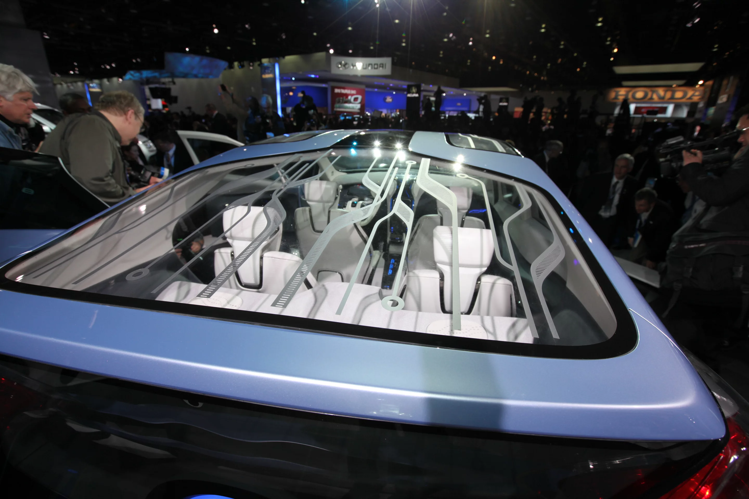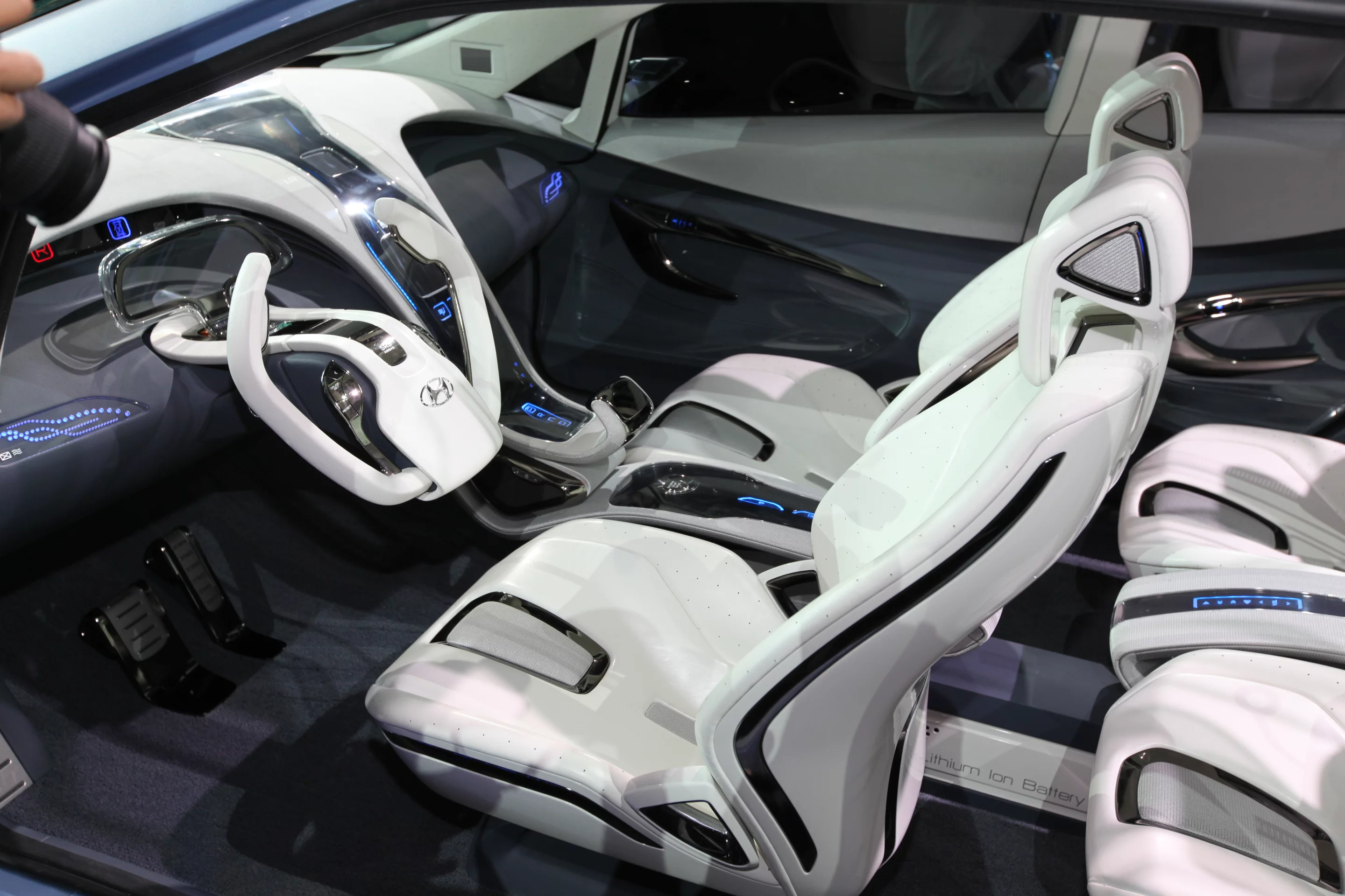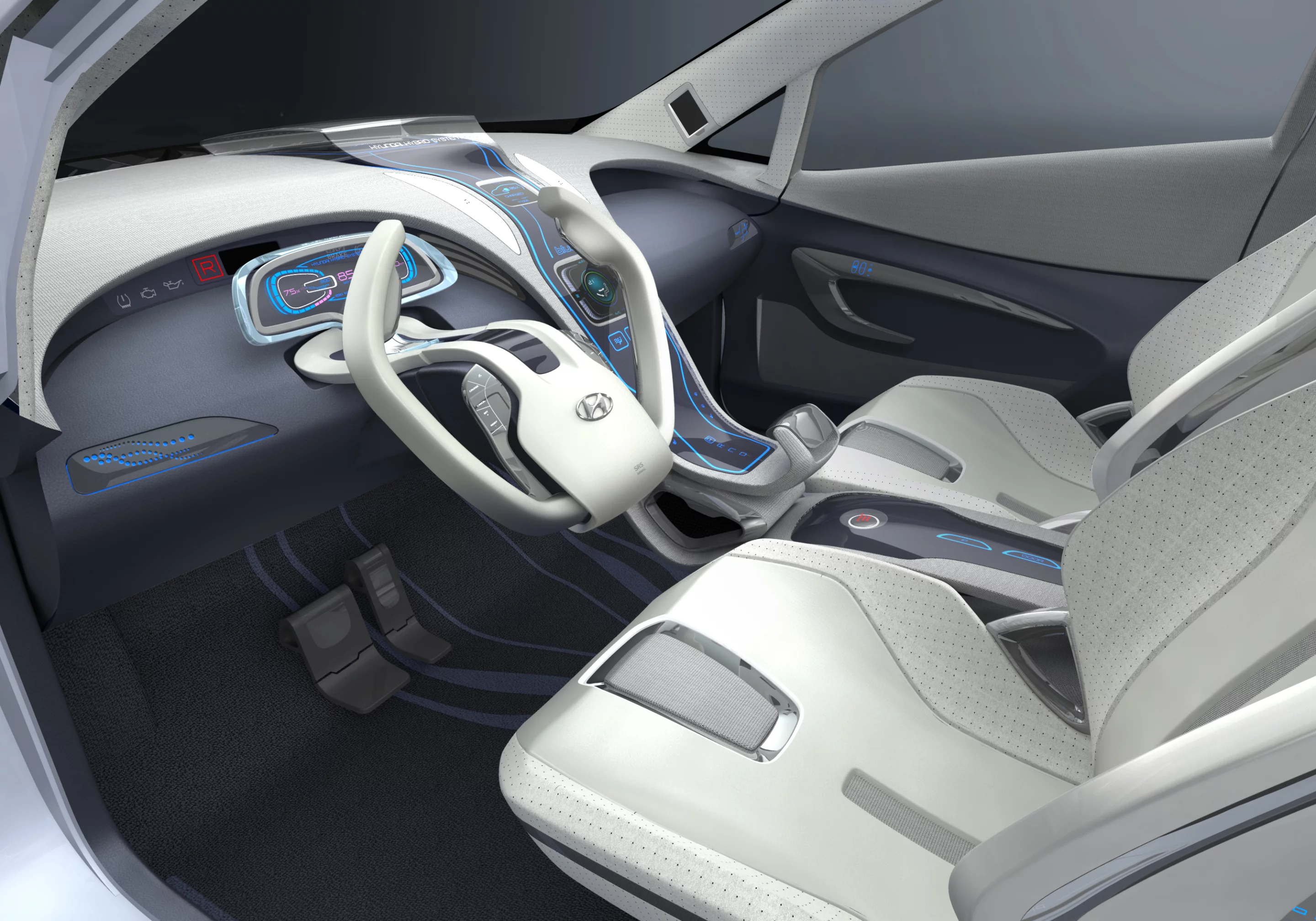 Hyundai's tasty Blue Will concept car turned up at the Detroit NAIAS this week for its first showing on American soil. We got to take a close-up look at the Korean company's blue-sky plug-in hybrid and were impressed by some of the details - headlamp surrounds made from recycled PET bottles, a full undertray for sleek aeros, a glass roof impregnated with solar cells, drive-by-wire steering column and a thermal generator to turn waste heat from the combustion engine into electricity.