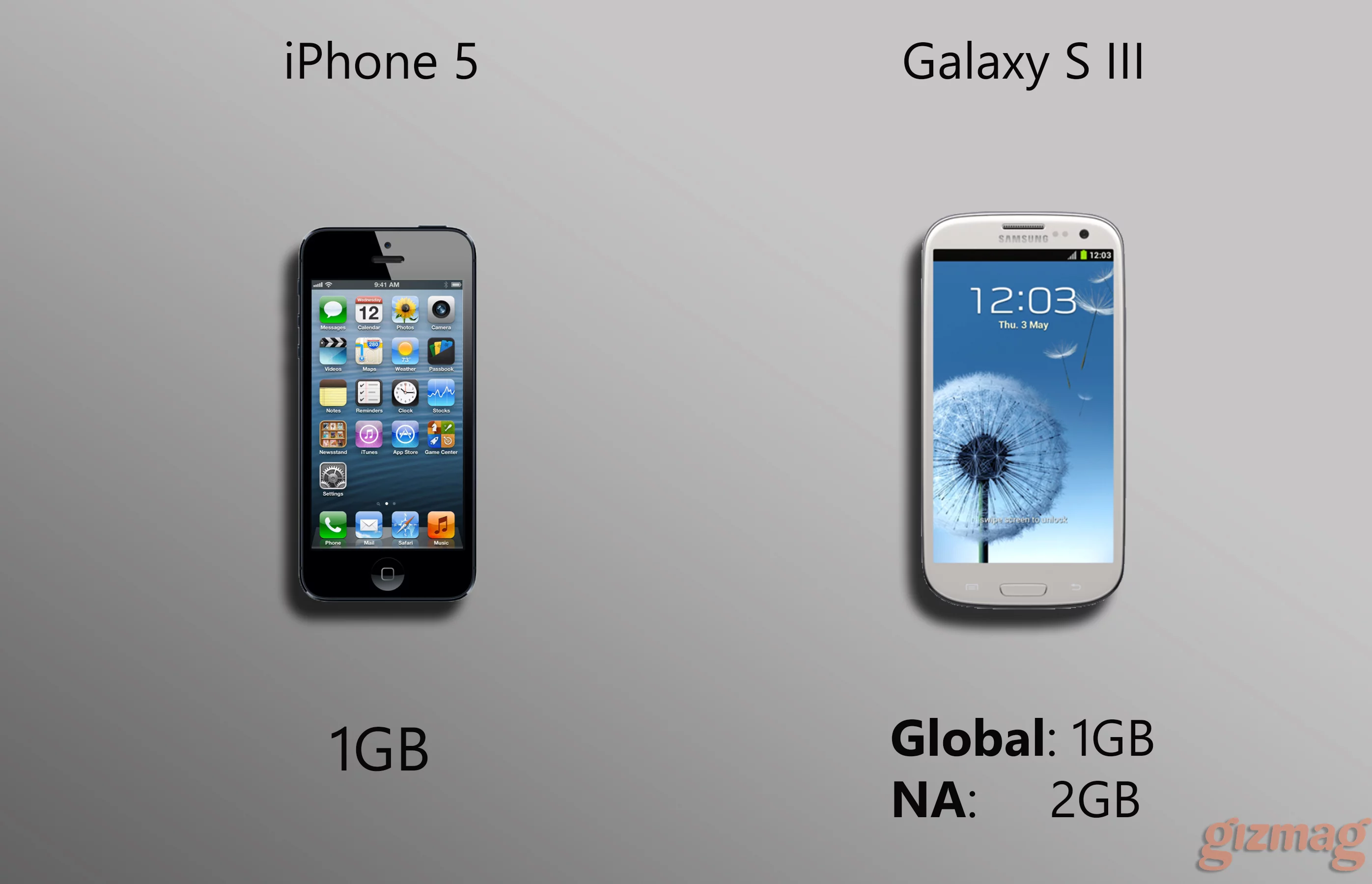 Another big factor in performance, RAM is evenly matched at 1GB in the iPhone 5 and the global Galaxy S III. The US/Canada S3, meanwhile, doubles the memory with a whopping 2GB.