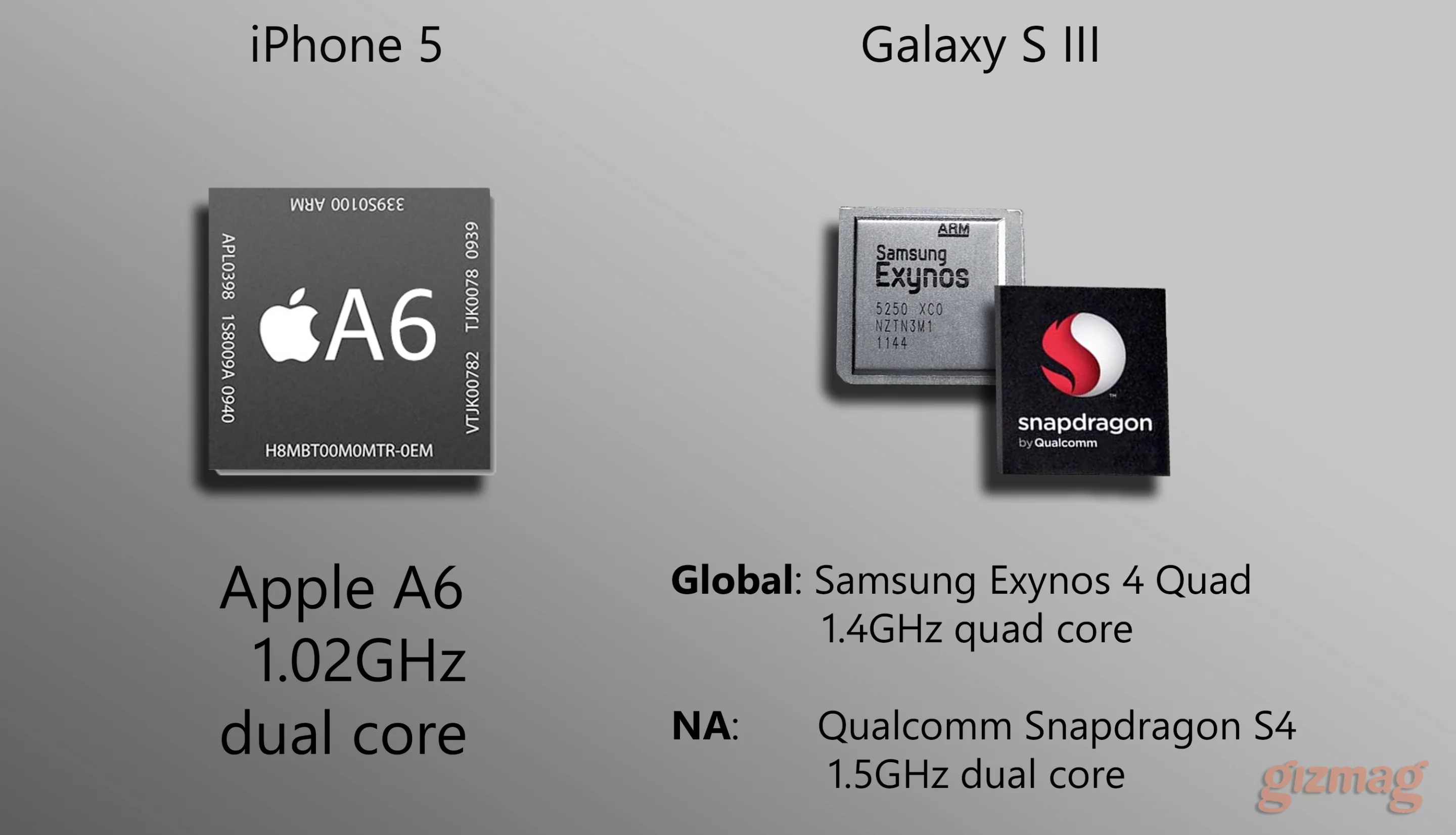 Remember when I said specs weren't everything? These chips are great examples. On paper, the processors in both versions (North America and international) of the Galaxy S III are superior - faster clock speed and an equal or greater number of cores. But early tests reveal that Apple's custom A6 SoC is a beast, breaking records in Geekbench and Sunspider benchmarks.