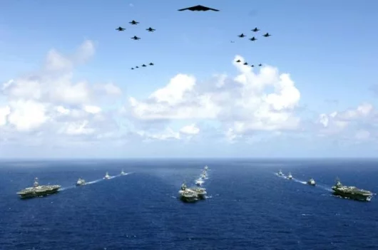 June 21, 2006 This remarkable image must constitute one of the greatest collections of leading edge technology ever assembled in one place and part of an amazing photographic gallery for this story. And the sizeable chunk of war machine is just a fraction of what's being put through its paces on and around Guam this week in Operation Valiant Shield, a U.S. Pacific Command exercise which focuses on integrated joint training and interoperability among U.S. military forces while responding to a range of mission scenarios. The exercise is designed to make sure U.S. forces have a seamlessly integrated environment where they can conduct deterrence-type missions and, if deterrence fails, high-intensity combat operations. The image shows the awesome B-2 Spirit and 16 other aircraft from the Air Force, Navy and Marine Corps flying over the USS Kitty Hawk, USS Ronald Reagan and USS Abraham Lincoln carrier strike groups. The joint exercise consists of 28 naval vessels, more than 300 aircraft and approximately 20,000 service members. For the record, the B-2 Spirit is powered by four F-118-GE-100 engines each with 17,300 pounds of thrust which can propel it to high subsonic speeds carrying 40,000 pounds of bombs with an unrefueled intercontinental range and an effectively indefinite range given air-to-air refueling. The B-2 Stealth bomber can reach across the globe to attack more than a dozen different aimpoints with surgical accuracy in a single pass! There are 21 active B-2 Spirits in the US military inventory, each costing US$1.157 billion. Who needs a foreign policy?