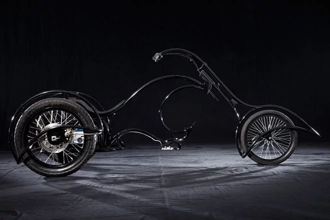 The jet black, carbon steel framed trike measures 8.4 feet (2.6m) long with a 20 inch front wheel and two 26 inch wheels at the back.