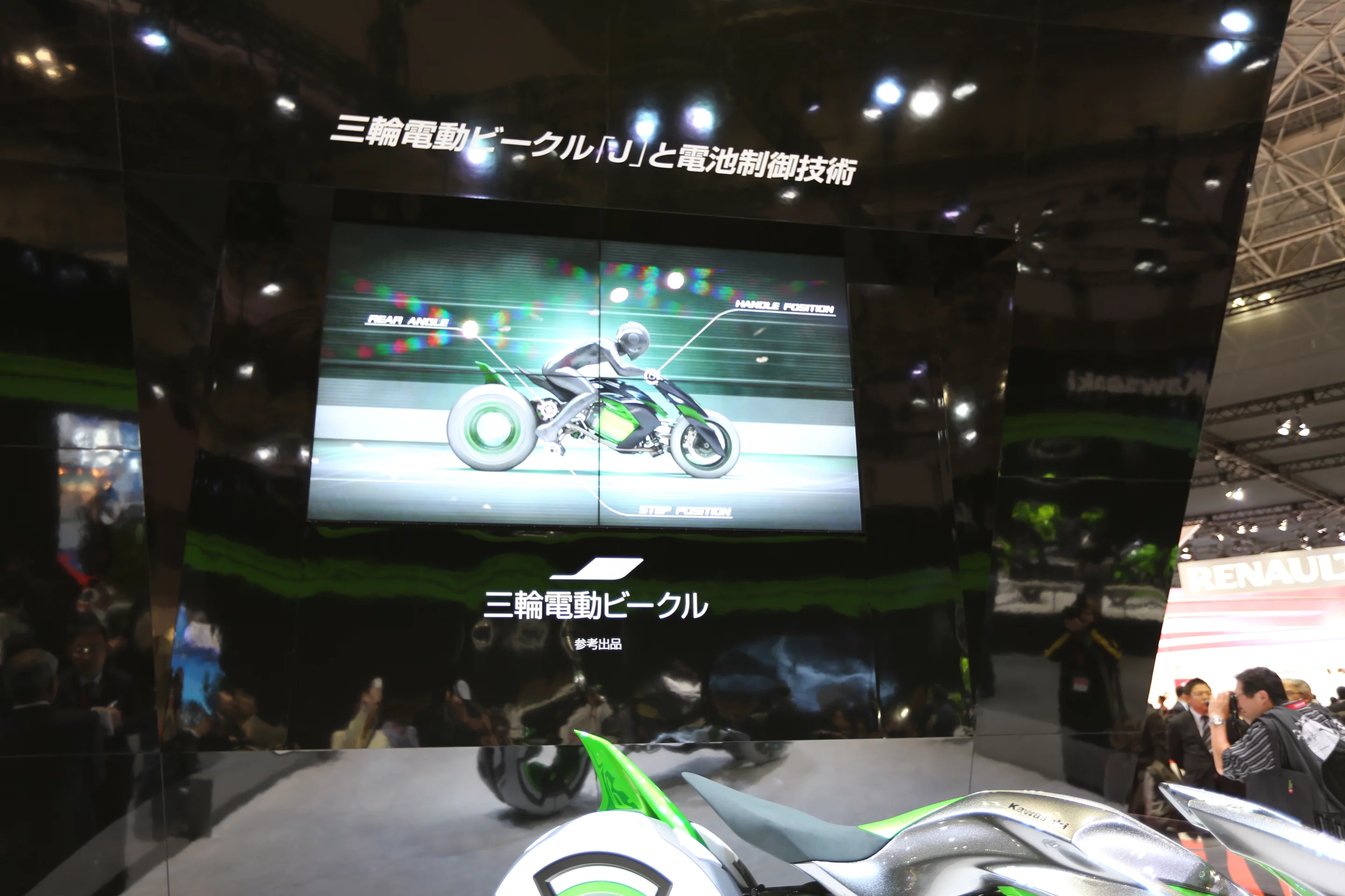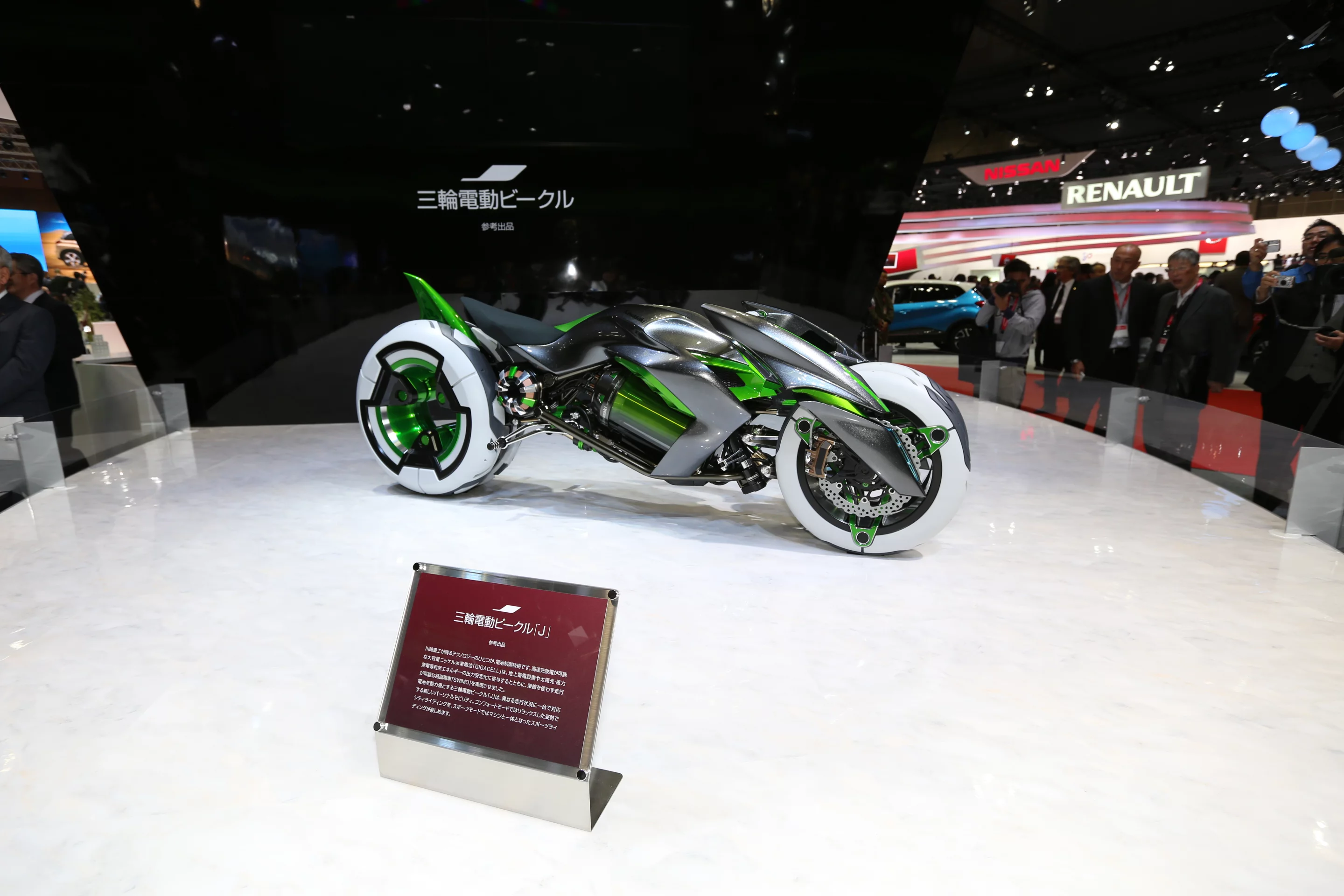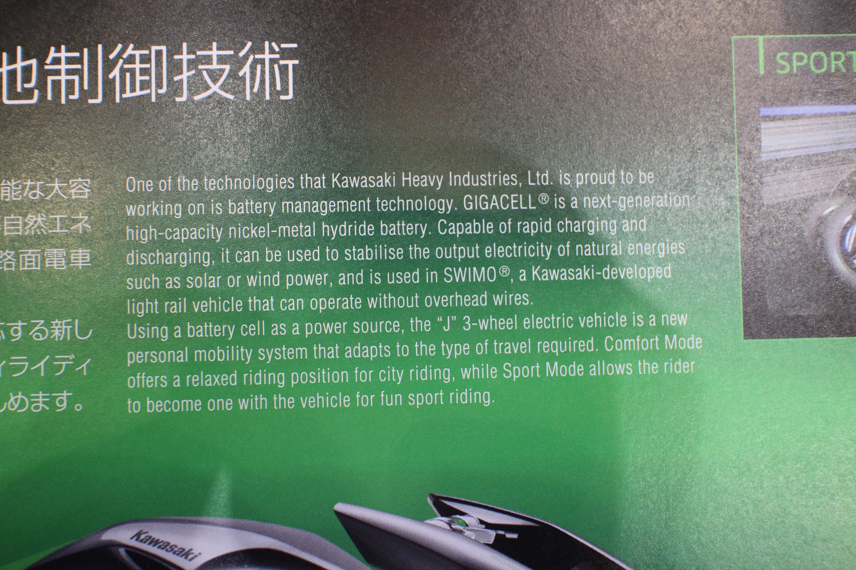 Details of the all-electric vehicle's drive-train are scant, but Kawasaki says the J concept makes use of its proprietary battery management technology and GIGACELL high-capacity nickel-metal hydride battery.