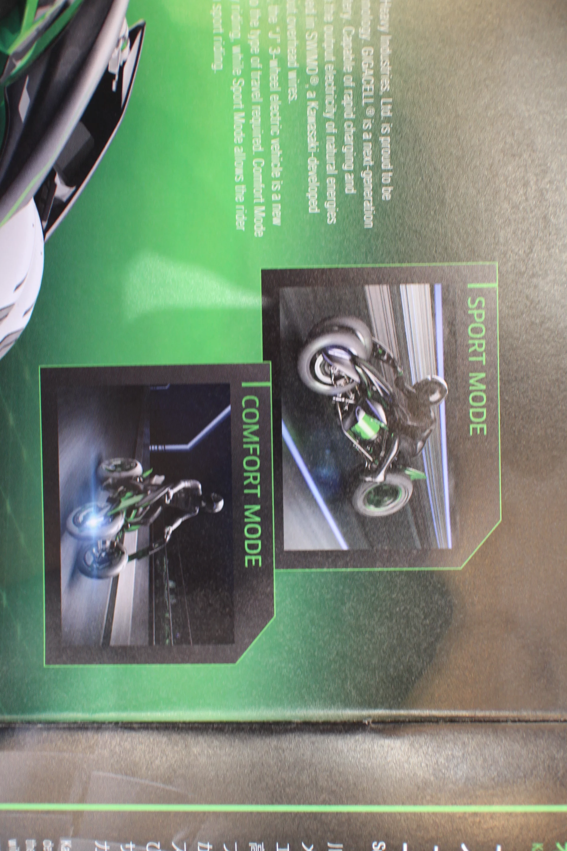 Looking something like a Tron Lightcycle in Kawasaki Lime Green livery, the J is able to morph between a low-slung riding position (Sport Mode) that allows the rider to carve through corners at speed and a higher stance (Comfort Mode) in which the distance between the front wheels is widened for more relaxed urban cruising. Steering-wise, the J has neither a wheel or handlebars, instead employing two levers that seem akin to those found on zero-turn ride-on lawn mowers.