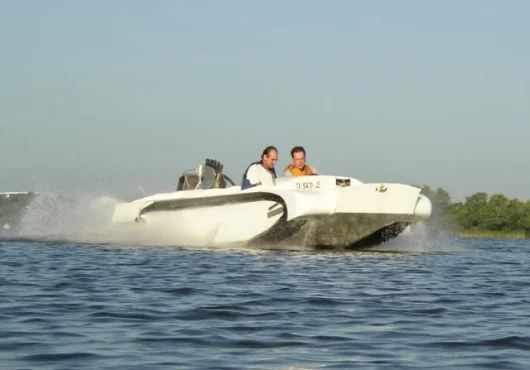 Two and a half years of land and water testing have proven the concept. FastTrack 1 has pulled two water skiers. It has gone from a standstill to 27 mph with six people on board, and to 39 mph with one.