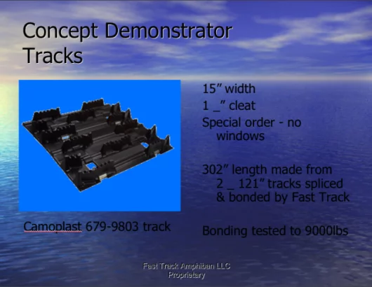In addition, there could be revolutionary transport opportunities for utility, cargo and personnel transport for operations in the arctic tundra and other seasonally inaccessible places. Analytical studies indicated that Fast Track technology would be applicable to vehicles as large as 25,000 lb gross weight. Using tracks as the sole means of propulsion has several advantages, over wheel/water jet or propeller amphibians and provides the best all terrain capabilities.