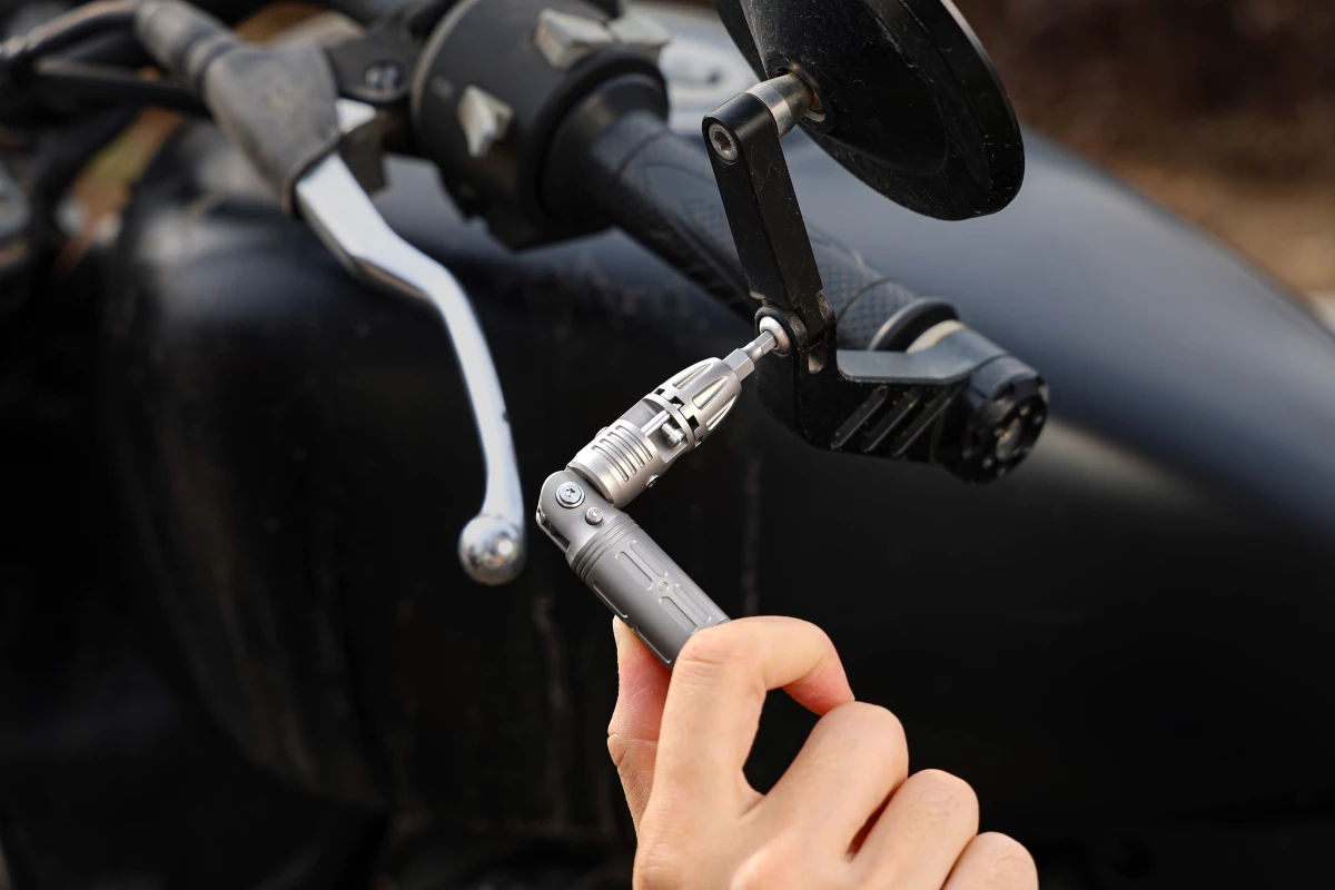 The central idea is an articulating head that locks at four positions: zero degrees (straight), 30 degrees, 60 degrees, and 90 degrees. That last angle transforms the tool into an L-shaped configuration, putting it in the same mechanical family as a hex/Allen key, but with a ratchet and interchangeable bits. In tight spaces where a straight driver can't complete a full rotation, that elbow geometry is the difference between finishing the job and abandoning it after hurting your wrist, skinning your knuckles, and questioning your life choices.