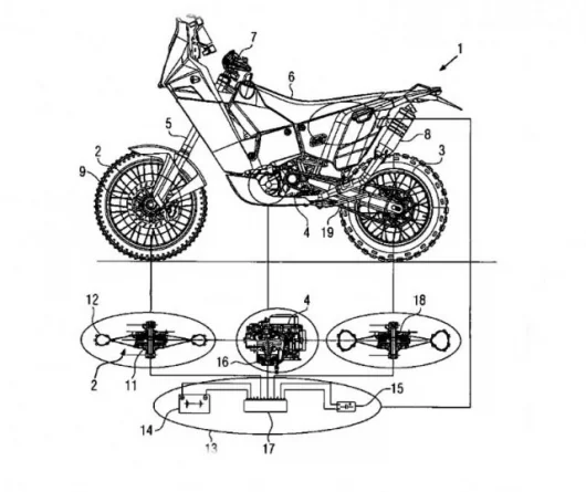 November 12, 2008 Patents lodged by Austrian Competition Motorcycle Manufacturer KTM indicate that a hybrid 2WD dirt bike is not far away. Common sense dictates that a motorcycle with both wheels driven (2WD) will go around corners faster and with greater surety than one equipped only with the motorcycle’s traditional rear-wheel drive, much the same as 4WD cars offer superior traction to their rear or front wheel drive brethren. A lot of interesting development work has been done over the last decade with Yamaha offering Ohlins 2WD system on selected enduro bikes in Europe, Christini developing mechanical AWD (aka 2WD) kits for Honda and KTM dirt bikes and KTM talking publicly about its hydraulic 2WD development. Now it appears KTM is to employ a small electric motor on each wheel to supply additional torque when it’s needed. A recently filed set of patent applications heralds some exciting prospects.