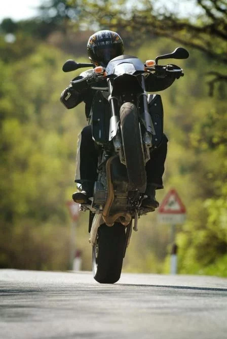 The wide bars and powerful sensitive brakes of a supermotard enable non-experts to corner faster and with much greater control, and given some practice, to “back the bike into a corner.” At roadgoing speeds, the supermotard geometry makes a lot more sense.