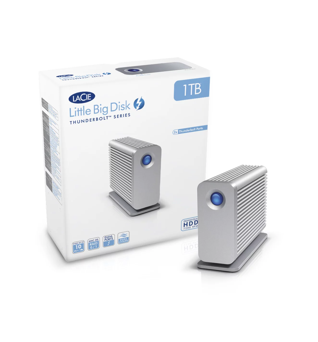 The drive can be configured as a striped RAID set (RAID O) for improved performance or a mirrored RAID set (RAID 1) for data protection. It also comes with dual Thunderbolt ports for daisy chaining of up to six compatible devices and a Thunderbolt cable is included with purchase.