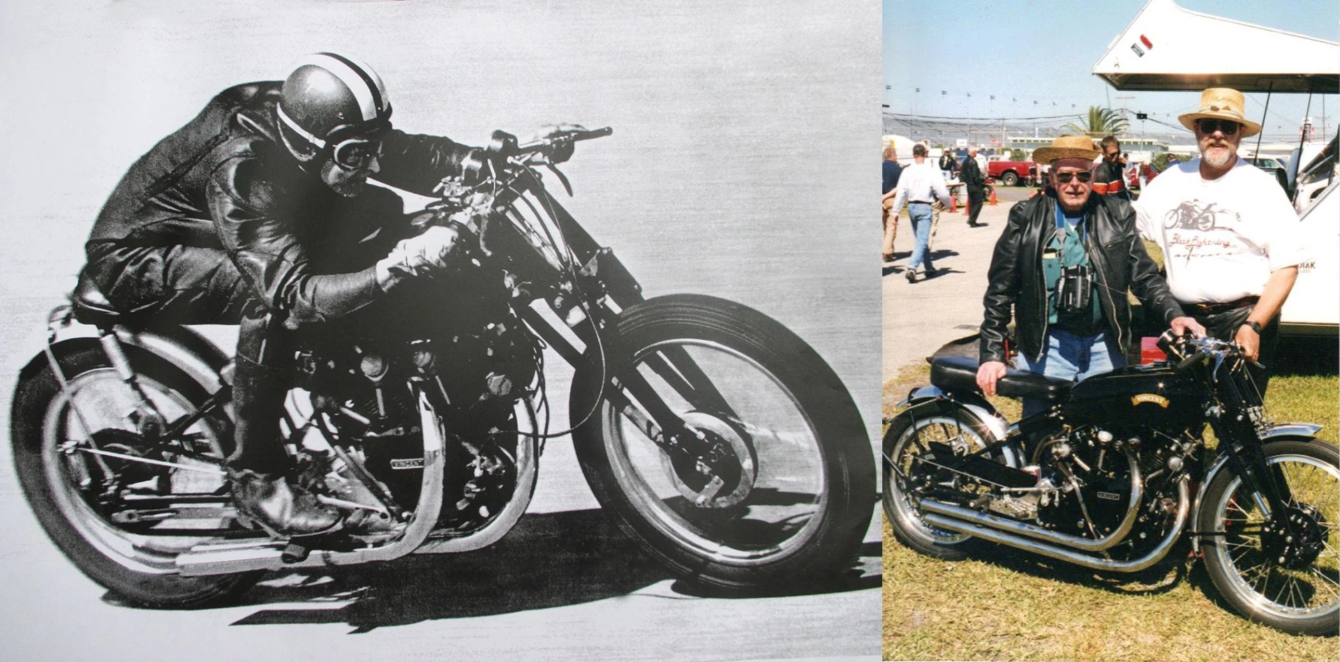 Somer has had the bike for many years and in his ownership it has won awards at numerous concours events, including the AMA Daytona Show, Del Mar Concours, British & European Classic Motorcycle Day in Olney, Maryland, several Vincent Owner's Club rallies and the Amelia Island Concours. In 1997 the Vincent was ridden for parade laps at Daytona Speedway, where it was reunited with LaBelle. That's Ed on the banking at Daytona and Ed and Somer in the pits at Daytona.