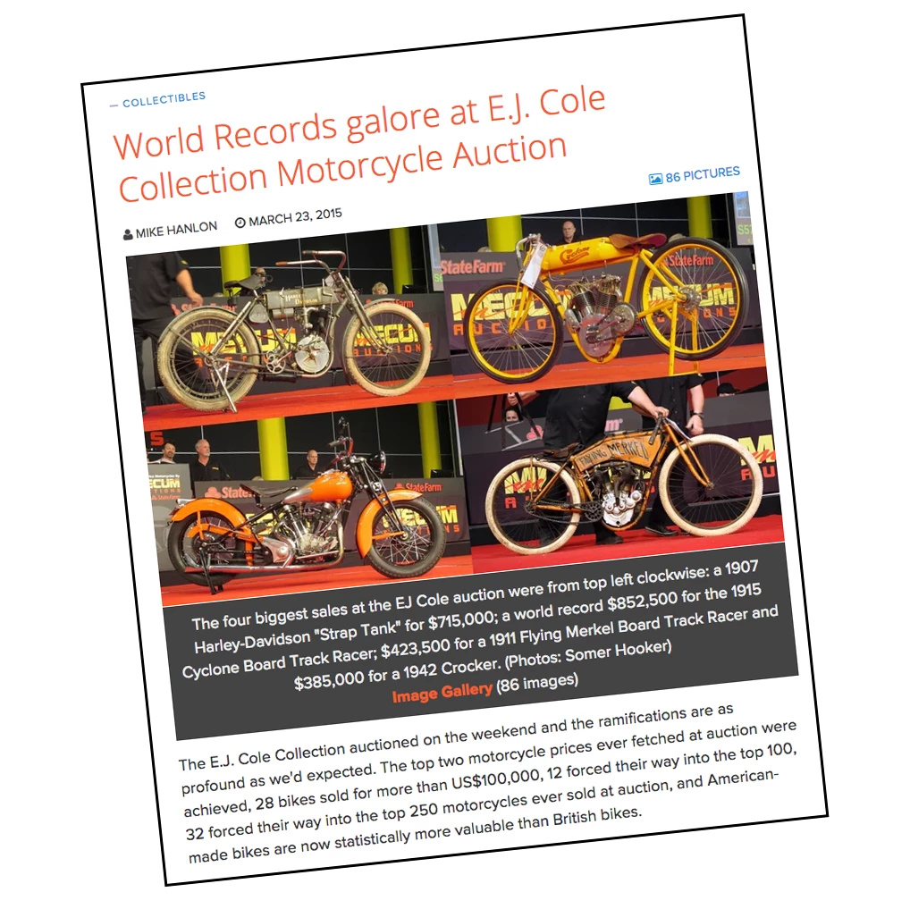 A 1907 'strap tank' from the E.J. Cole Collection dubbed "The Mona Lisa of Harley-Davidsons" for its highly original condition, sold earlier this year for $715,000, becoming the second most valuable motorcycle ever to sell at auction.