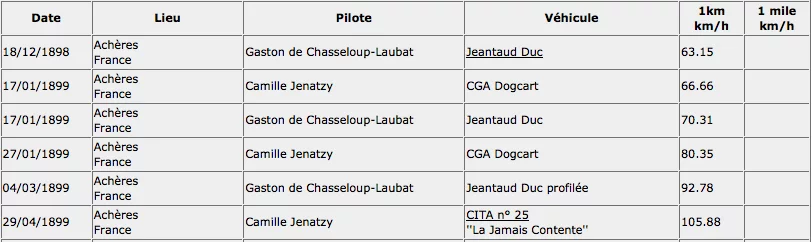 It all began when the French automobile magazine La France Automobile decided to hold trials. The top speed of 63.13 km/h (39.24 mph) recorded in those trials was set by Count Gaston de Chasseloup-Laubat driving a 36 hp electric Jeantaud.