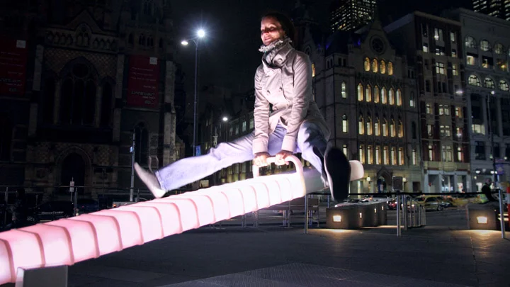 The 'A Tilt of Light' seesaw has been fitted with 33 rows of lights that react in real time to the motion and angle of the lever as children (and the occasional inquisitive adult) ride the playground equipment up and down. The high-tech seesaw was installed at Federation Square in Melbourne, Australia, as part of a lighting festival called The Light in Winter.