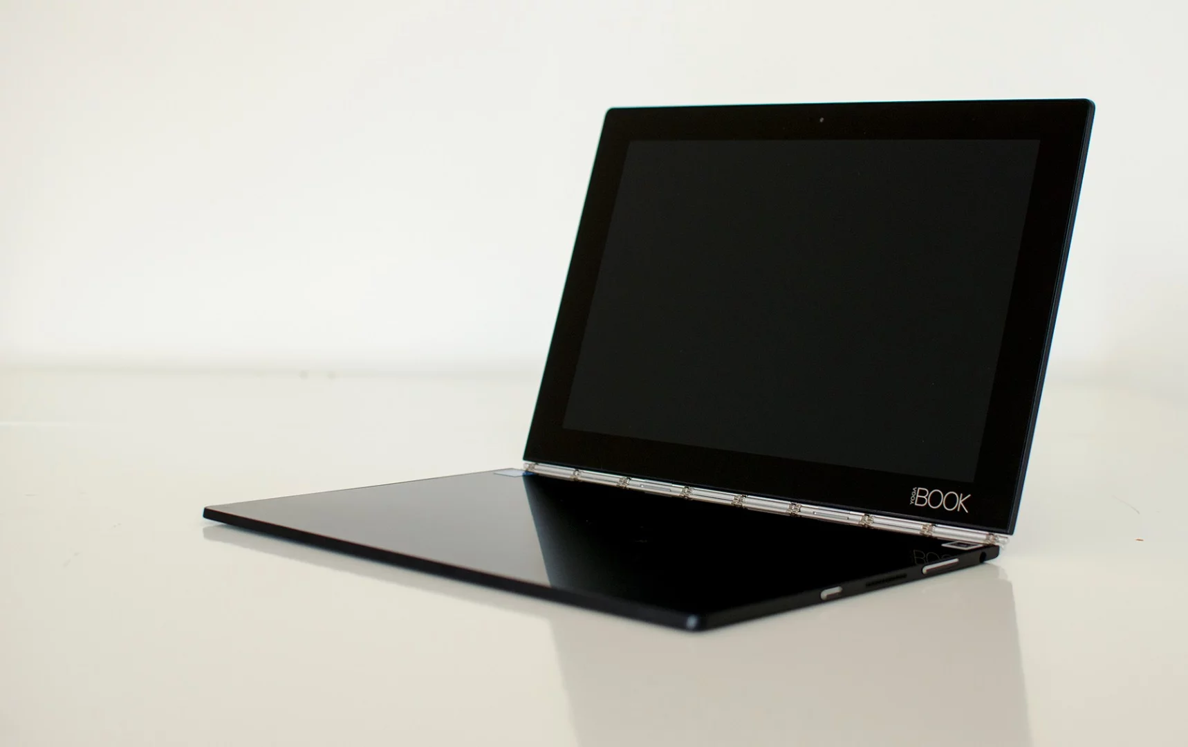 The Yoga Book stays promising beyond the first glance. While not exactly drool-worthy, the matte black metal case (also available in gold or gunmetal gray) is attractive enough. It occupies a sizing sweet spot: Not so small it's impossible to type on, but not large enough to be inconvenient to carry. The Book is somewhat heavy for its size, but that heft provides a solid foundation on which to write. It's highly smudge and scratch resistant as well.