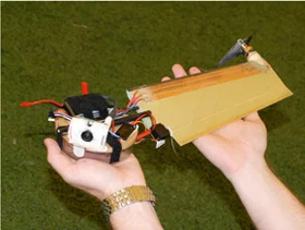 In development as part of DARPA's Nano Air Vehicle program since 2006, the Samarai Flyer consists of a disc-like unit that contains its battery and electronics, joined to a single wing with a propeller mounted at the far end - the original design actually called for a fuel-powered miniature jet thruster, which may still be the plan for the final version. When in flight, the whole aircraft spins around in a circle, with the disc at the center. A remotely-adjustable trailing-edge wing flap allows users to steer it.