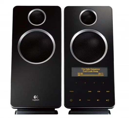 By putting touch-sensitive controls on the face of the Z-10 speakers, Logitech has eliminated the need for people to toggle between applications to control their music on their computer monitor. People can continue to work or surf the Web, or even turn their monitor off and use the integrated speaker controls to adjust volume, treble and bass, and navigate music tracks with play, pause, skip forward and back buttons -- just as they would with a portable music player or a traditional stereo system. Using USB technology and sophisticated software, the speakers can display track information from popular media players, including iTunes, Windows Media Player, Winamp, and Musicmatch. The digital display also reveals a clock, volume levels and other system information from the PC.
