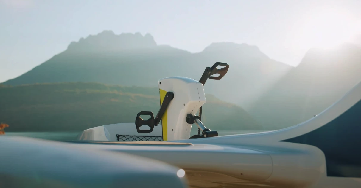 The E-Jetcycle's electric system is integrated within the pedal box and offers up to 200 watts of motor assistance. The rider can select from different levels of e-assist, and the battery is designed for up to three hours of runtime meant to ease the burden on the rider and/or allow them to explore farther and longer on the water. As on the original Jetcycle, side levers provide control of steering and foiling action.