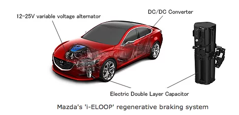 Regenerative braking systems used in most current hybrid and electric vehicles convert a vehicle's kinetic energy as it decelerates into electricity, which is used to recharge a battery that powers an electric motor. In contrast, Mazda's new "i-ELOOP" (Intelligent Energy Loop) system is designed to be used in internal combustion engine-powered cars with the energy captured used to power the climate control, audio system and other electrical components. This gives the system the advantage of not requiring a dedicated electric motor or battery.