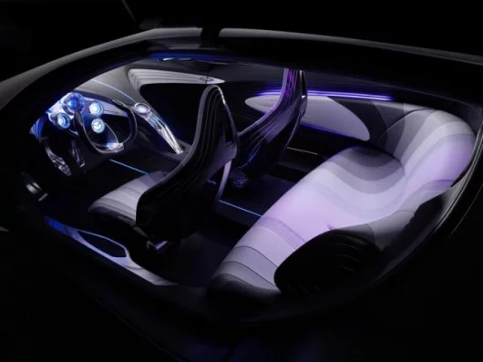 As the doors rise to expose the interior of Ryuga and allow easy slide-in access, the passengers are presented with the fusion of a cockpit - designed to maximize the emotional connection between the car and driver - with the social atmosphere of the rear passenger space, where lounge-like comfort is ensured through expansive space and Nagare-inspired design.