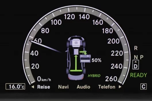 The driver is also able to monitor the status of the hybrid drive system visually. The instrument cluster has a separate, centrally positioned, display showing the energy flow during boost and recuperation phases, as well as the battery charge status.
