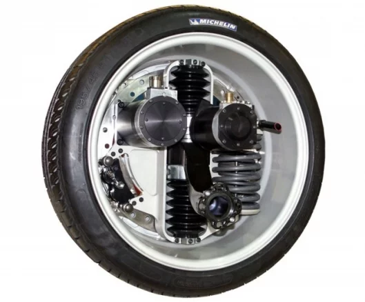 Each Michelin in-wheel motor weighs 42 kilogram (95 pound) and includes a 30 Kilowatt water-cooled drive motor of a similar size to a conventional starter motor. The motor has a spur gear that drives a rind gear on the hub. A second electric motor operates the active suspension via a gear rack and pinion that effectively replaces the normal hydraulic shock absorber (no news on if they are used as regenerative shocks). There is also a coil spring to hold the static load of the car and a small outer rotor disc brake. The wheel motor is attached to the vehicle chassis by a single lower control arm suspension arrangement.