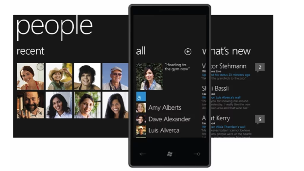 People: This hub brings together relevant content based on the person, including their live feeds from social networks and photos. It also provides a central place from which to post updates to Facebook and Windows Live in one step.