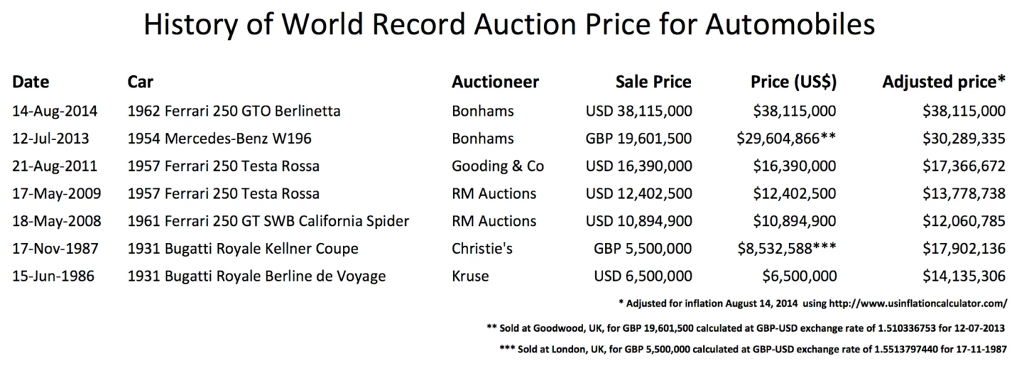 The 1931 Bugatti Royale Kellner held the record for 20 years prior to that flurry of activity which saw its $8,532,588 price (astonishing for 30 years ago) topped by first the $10.9 million Ferrari California Spider in 2008 then a $12.4 million Ferrari Testa Rossa, a $16.4 million Ferrari Testa Rossa, Juan Manuel Fangio's $30 million Mercedes-Benz Silver Arrow W196, then the 250 GTO and all in quick succession.