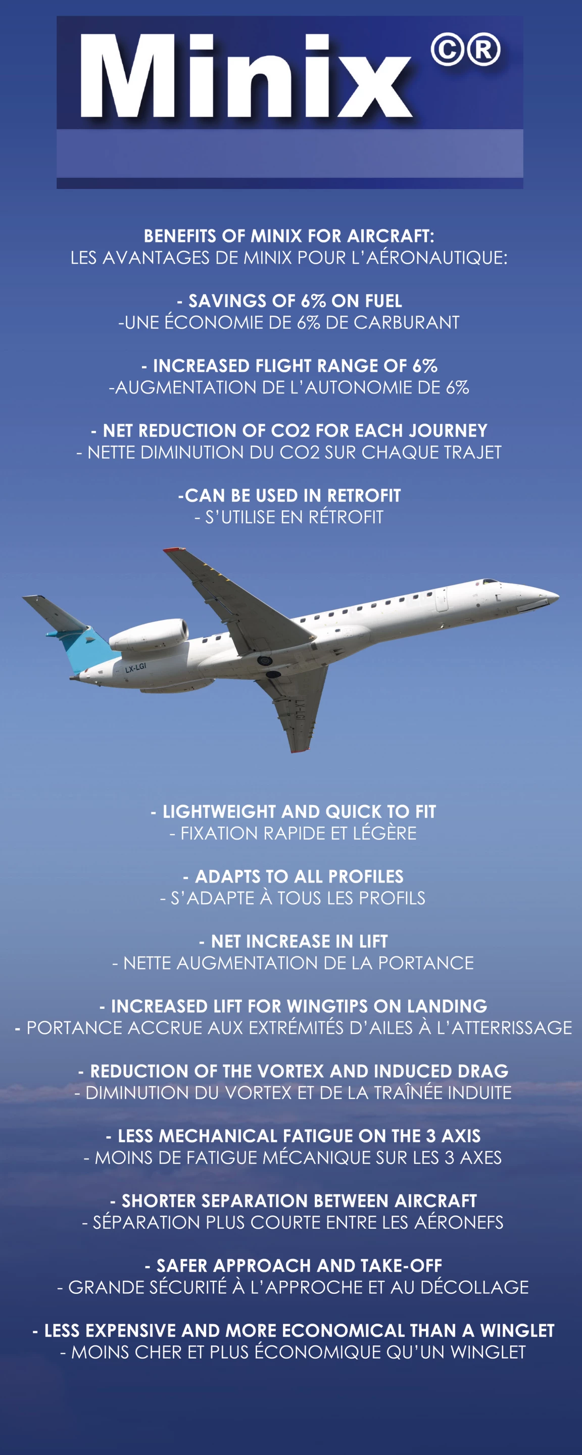The Minix device sits at the tip of an aircraft's wing as a replacement to the vertical or tilted winglets now common on many craft. Its primary purpose is to smooth out and negate the high-pressure spiral vortices that form when a plane is in motion as the high-speed airflow struggles to deal with the complex pressure differences in the area where the wing terminates.