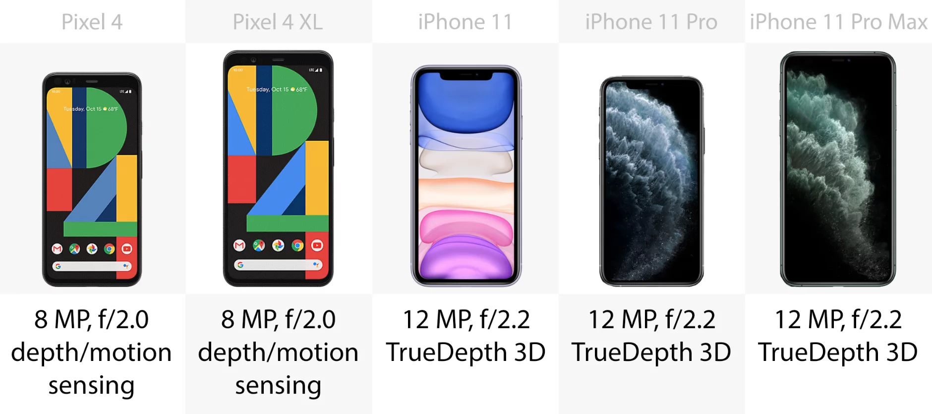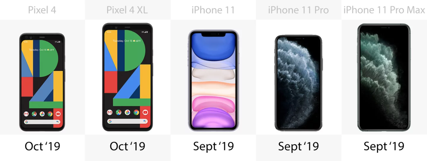 The iPhone 11, 11 Pro and 11 Pro Max all launched in September 2019. The Pixel 4 and 4 XL are due for release on October 24.