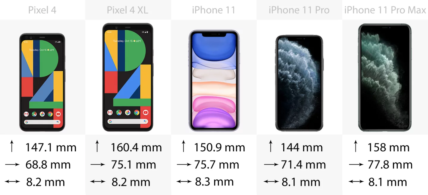 Size-wise, the iPhone 11 Pro is the smallest device on the list, followed by the Pixel 4. Next up is the iPhone 11, then there’s quite a gap before the 11 Pro Max and Pixel 4 XL come in close together at the top of the range. It’s interesting to note that the iPhones are generally shorter and wider than the Pixels.