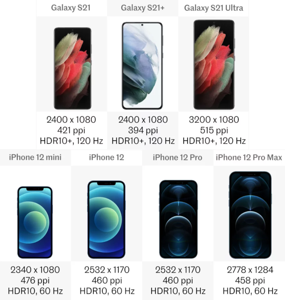Next is the iPhone 12 Pro Max, with an impressive 2778 x 1284 resolution at 458 ppi. And leading the pack is the Galaxy S21 Ultra, with a strangely-stretched 3200 x 1080 resolution and the highest density at 515 ppi.