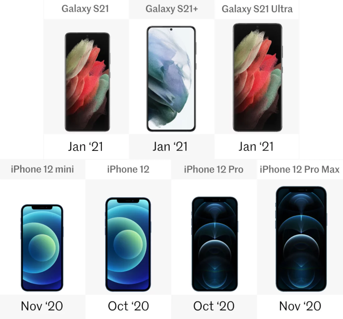 As usual, there are three new Galaxies, but this year Apple has decided to throw in a fourth iPhone (probably just to mess up our table here). The iPhone 12 mini is a budget model that’s surprisingly capable, and comparable in many ways to the Galaxy S21, so we’ve included it here. Besides that anomaly, the two lineups look similar – you’ve got the simple base model, the better-specced plus model and the over-the-top premium model. For both companies, the first two models are quite similar, with a much bigger gap to the premium model.Size