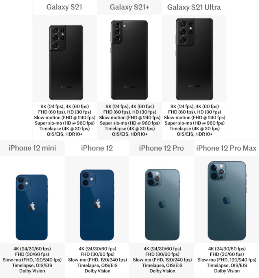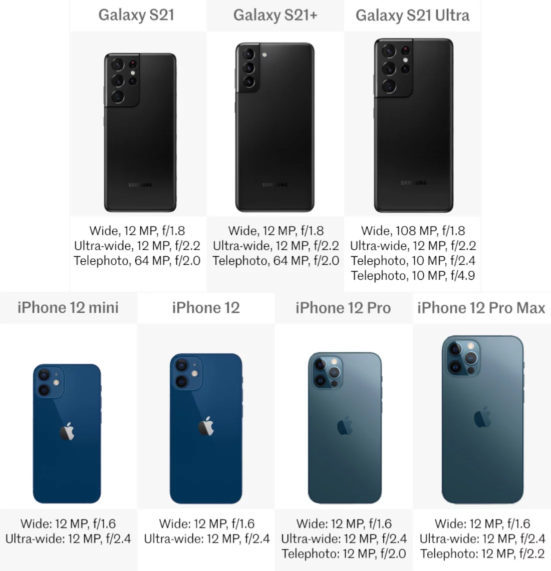 The base combo on each is a wide and ultra-wide lens, usually with 12 MP each and varying apertures (the f-numbers). The iPhone 12 Pro and Pro Max, and the Galaxy S21 and S21+, also add a telephoto lens to the mix, with 12 MP on the iPhones and a huge 64 MP on the Galaxies. Not content with just the one, the Galaxy S21 Ultra packs a pair of 10-MP telephoto cameras.Photo modes