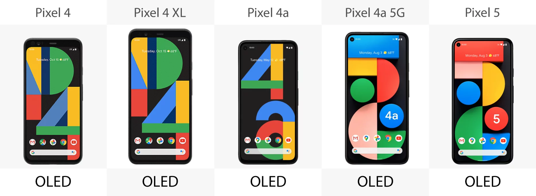 Not only is the Pixel 4 XL’s display the biggest, it also boasts the highest resolution – a huge 3040 x 1440 with a density of 537 pixels per inch (ppi). There’s quite a gap before the next highest resolution – a three-way tie between the Pixel 4a, 4a 5G and 5, on 2340 x 1080. These three models have different densities though, due to the fact that they’re fitting the same amount of pixels into different-sized screens. And the Pixel 4 brings up the rear, but it's only a little behind in sheer numbers.Display type