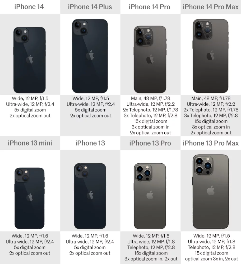 The iPhone 14 and 14 Plus have essentially the same main camera setup as the iPhone 13 and 13 mini – a wide and ultra-wide angle lens, both 12 MP, with 5x digital zoom and 2x optical zoom out. The only improvement is an ever-so-slightly wider aperture.