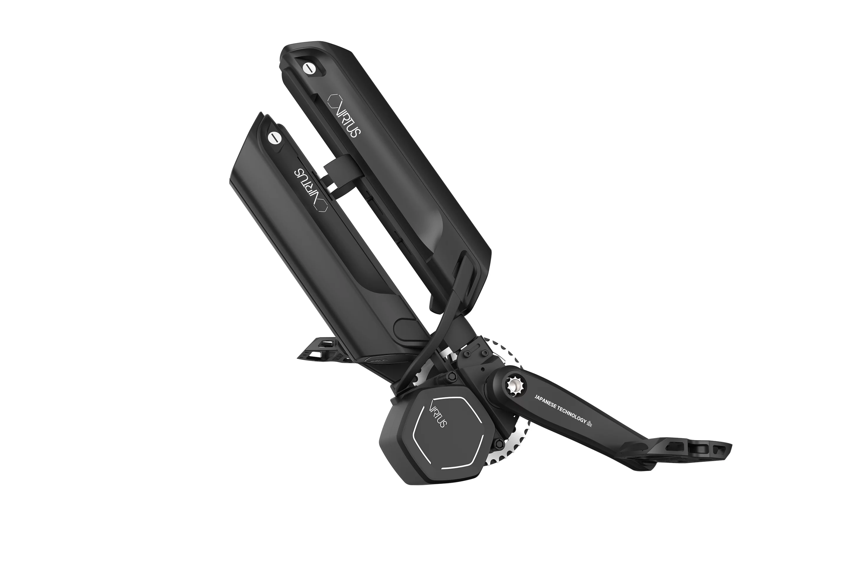The two main components of the Virtus are its 250-watt, 55-Nm motor and a multi-sensor controller that controls motor output and tracks torque, cadence, crank angle and speed. The multi-sensor unit can be used without the motor, providing performance-tracking on a standard pedal bicycle. The Virtus hardware also connects wirelessly to a smartphone to support performance-tracking and control features.